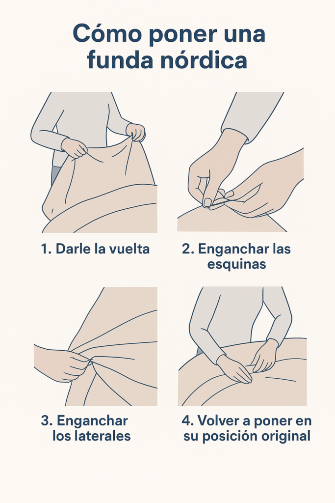 Su diseño exclusivo permite colocarla de forma rápida y sencilla. Solo tienes que darle la vuelta, enganchar las esquinas y los laterales del edredón, y devolverla a su posición original. Así de fácil: sin esfuerzo ni desorden.