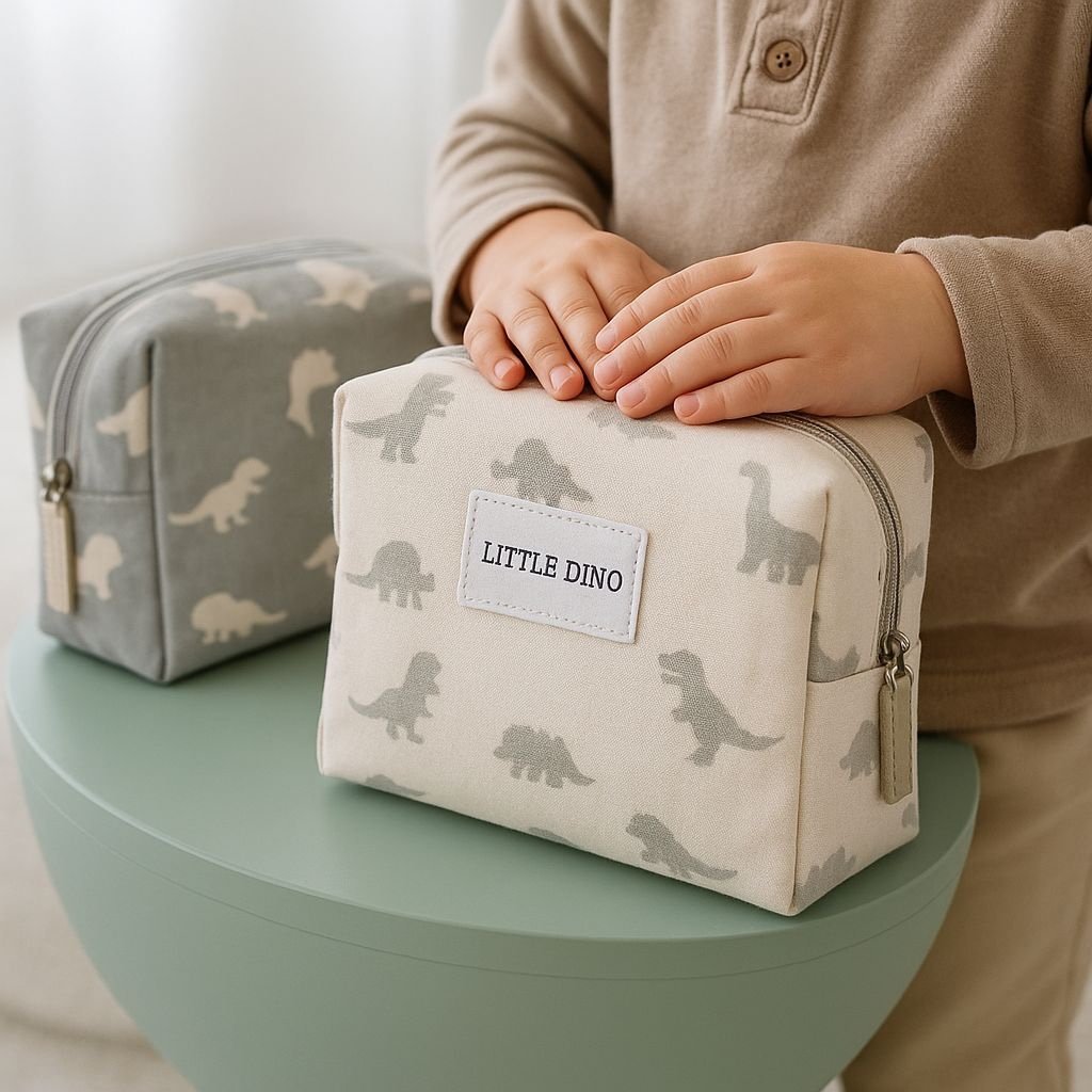 Bolsa con estampado de dinosaurio en color gris y blanco. Perfecta para múltiples usos, llevar la ropa de cambio, accesorios de neceser, accesorios playa/piscina ..