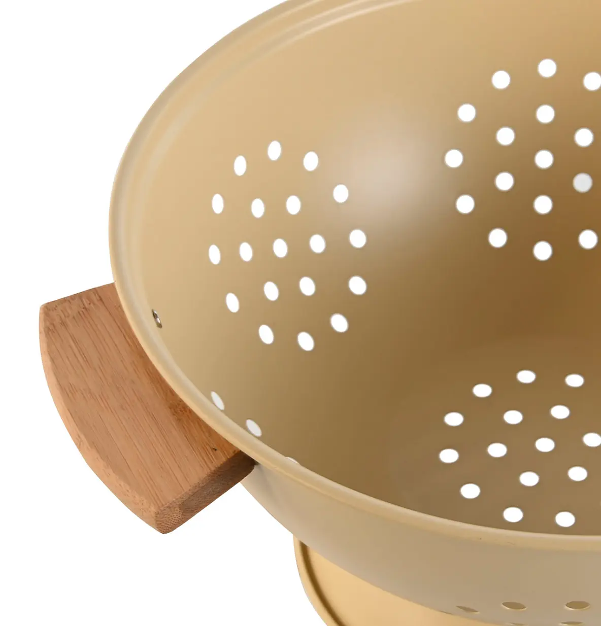 Decorativo y útil escurridor de cocina de acero inoxidable y bambú.