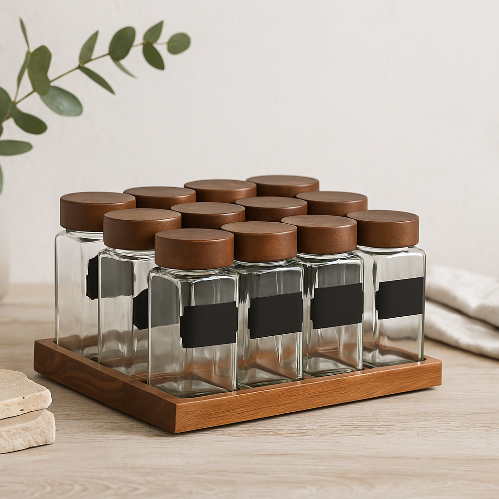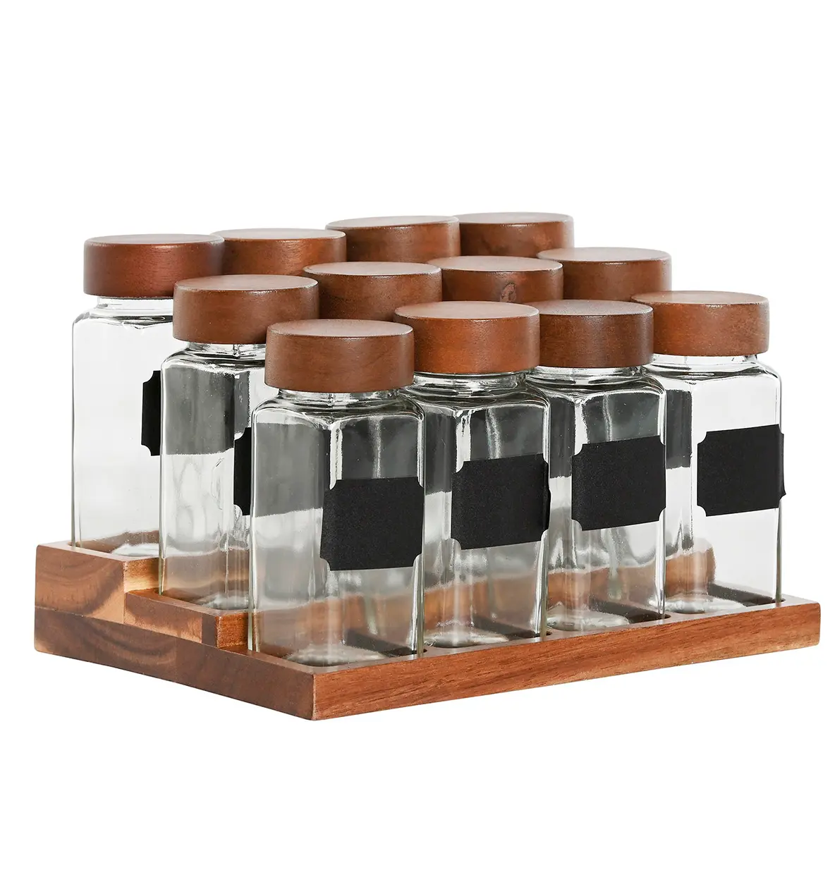Especiero práctico y bonito tres alturas que incluye 12 botes. Madera de acacia y cristal .