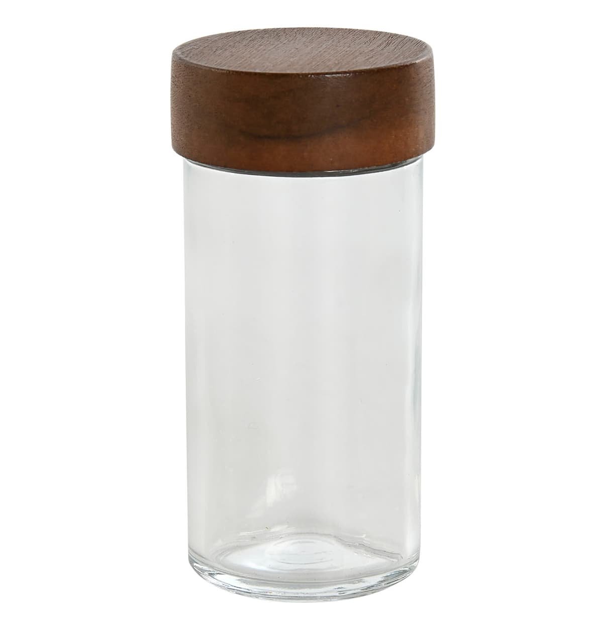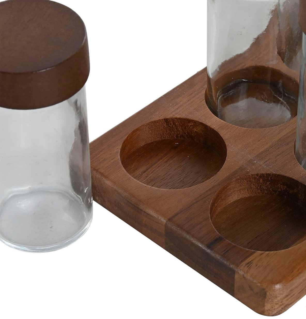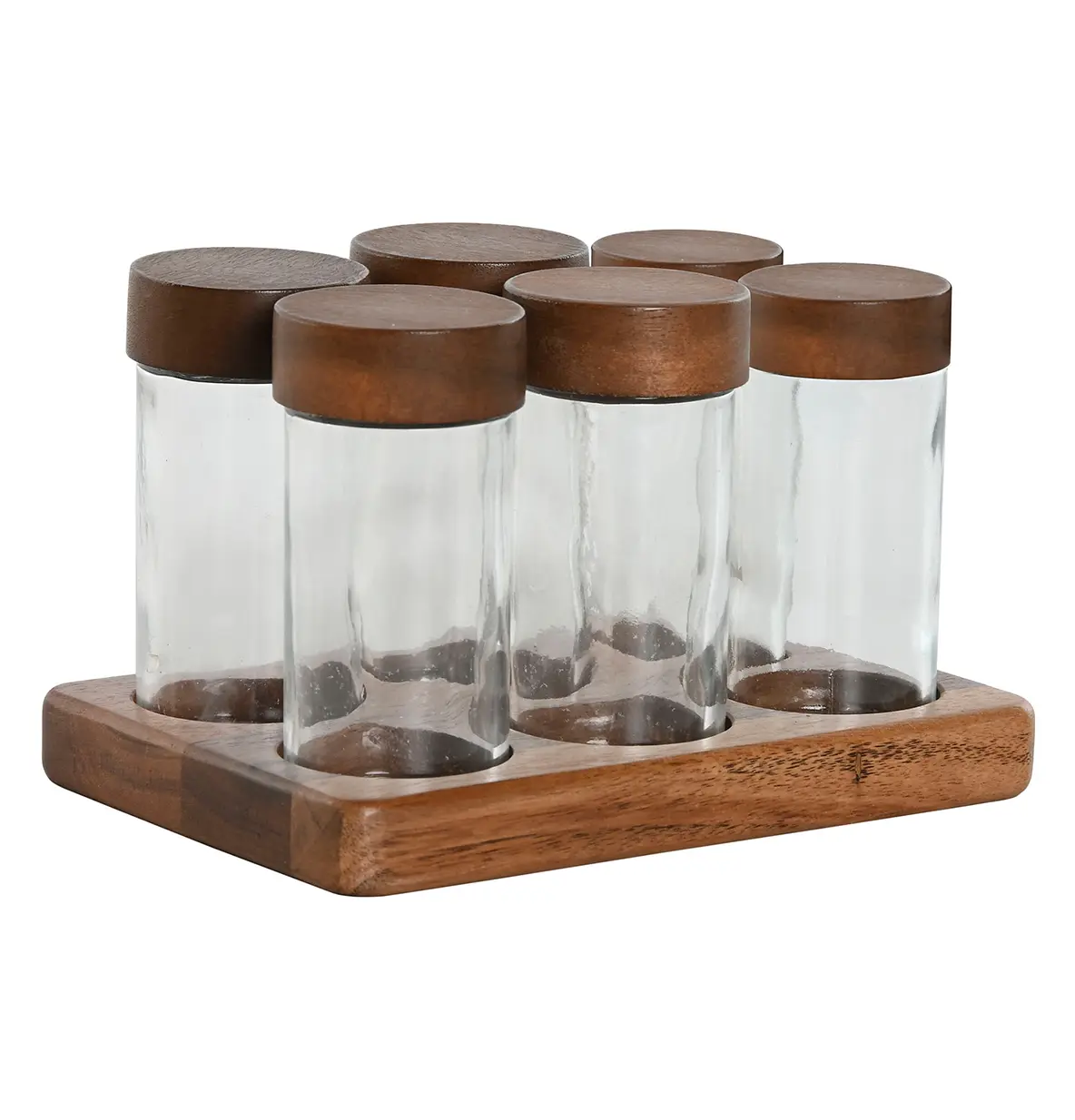 Bonito y práctico especiero con botes de cristal y madera de acacia. Incluye la base y 6 botes con tapa a rosca para 6 especias.